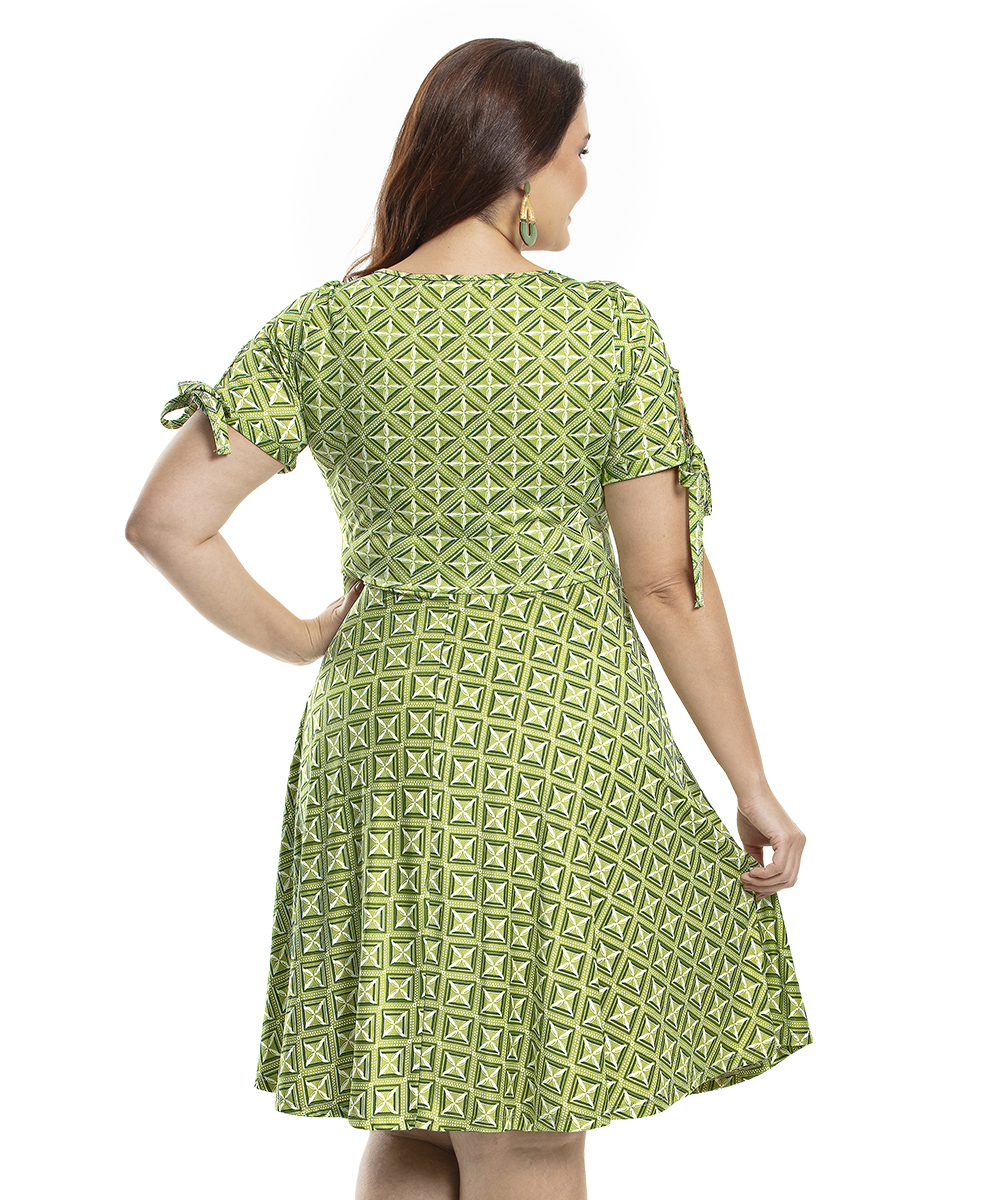 Vestido decote quadrado, mangas curtas com abertura e faixa embutida para